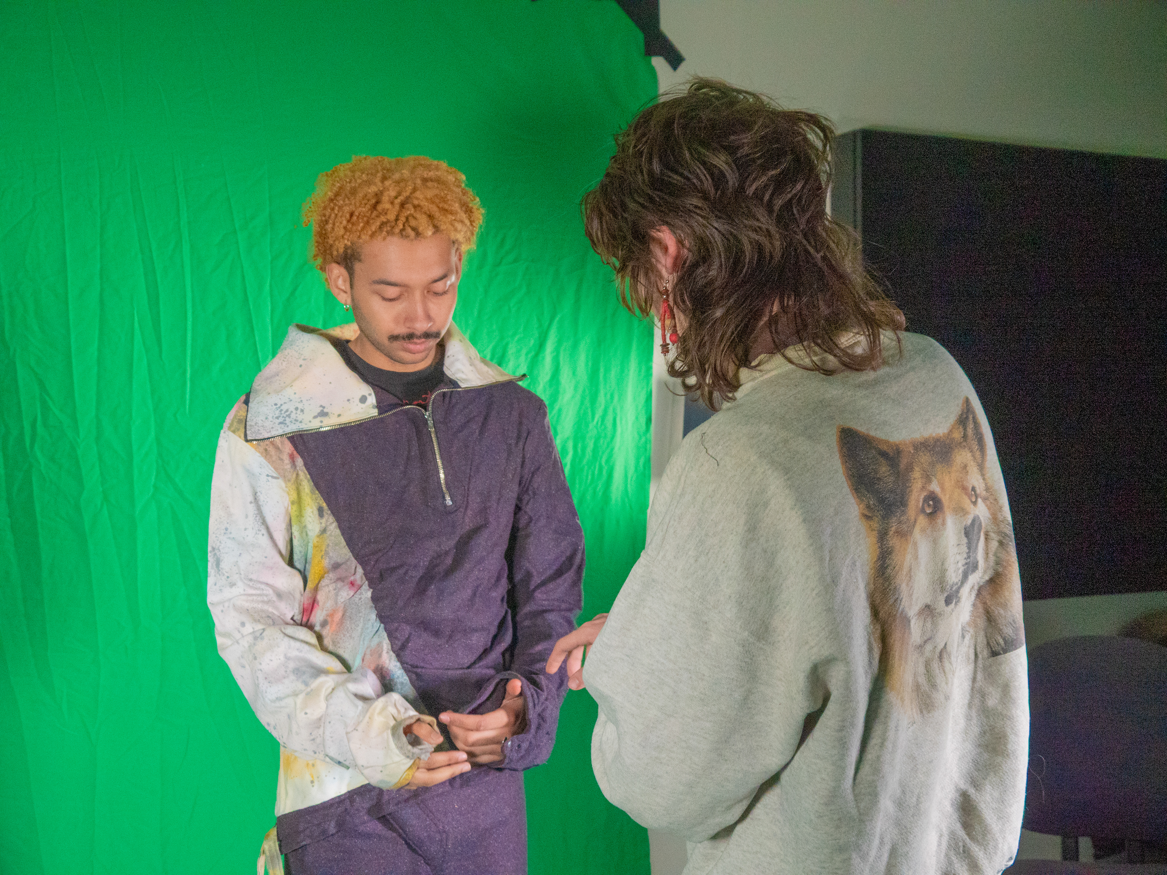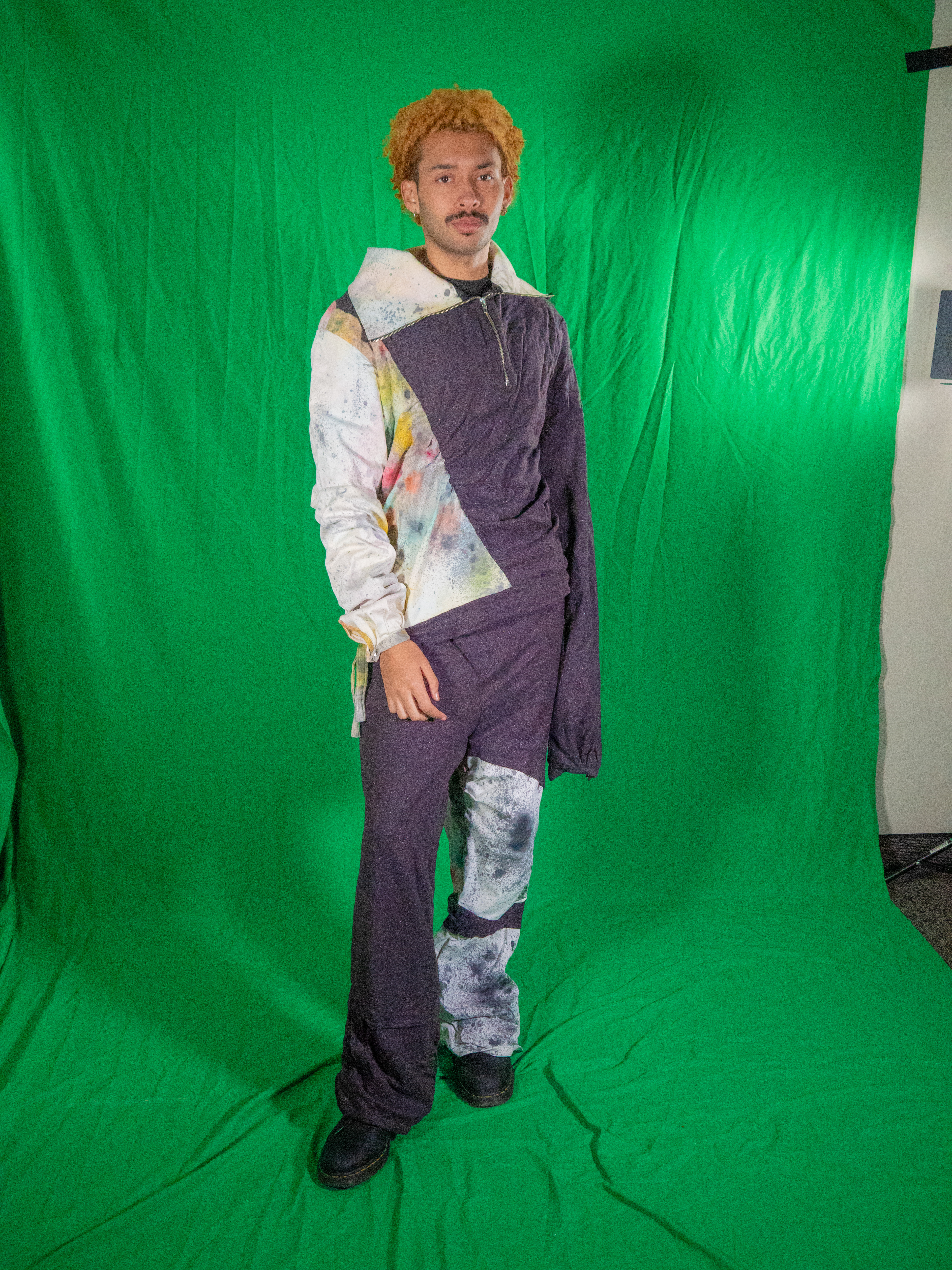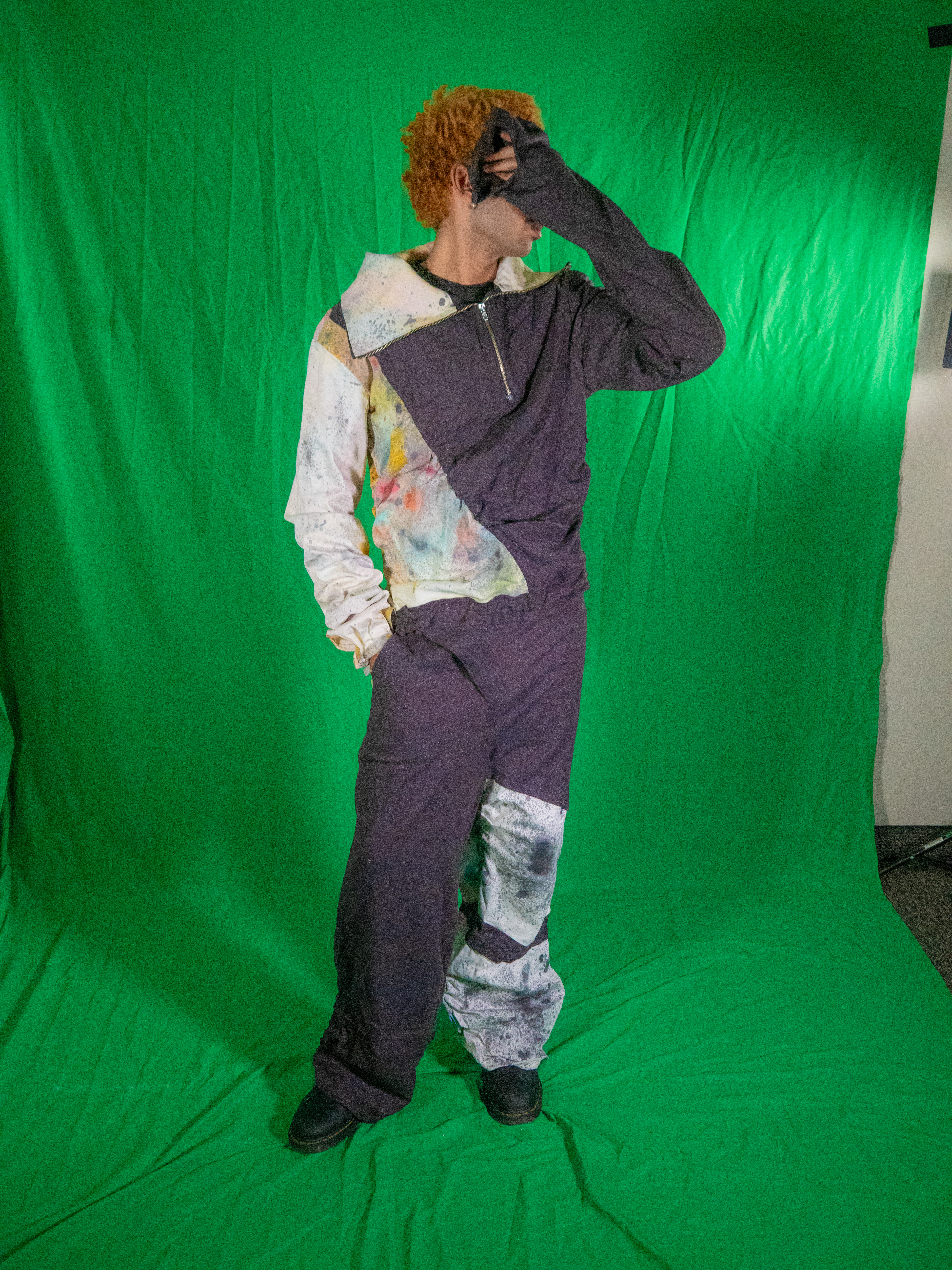 Paneled piece dyed gouache painted canvas and regenerated Manteco wool. High Neck asymmetrical drawstring Quarter-zip. Asymmetrical Paneled trousers with diagonal zipper fly.