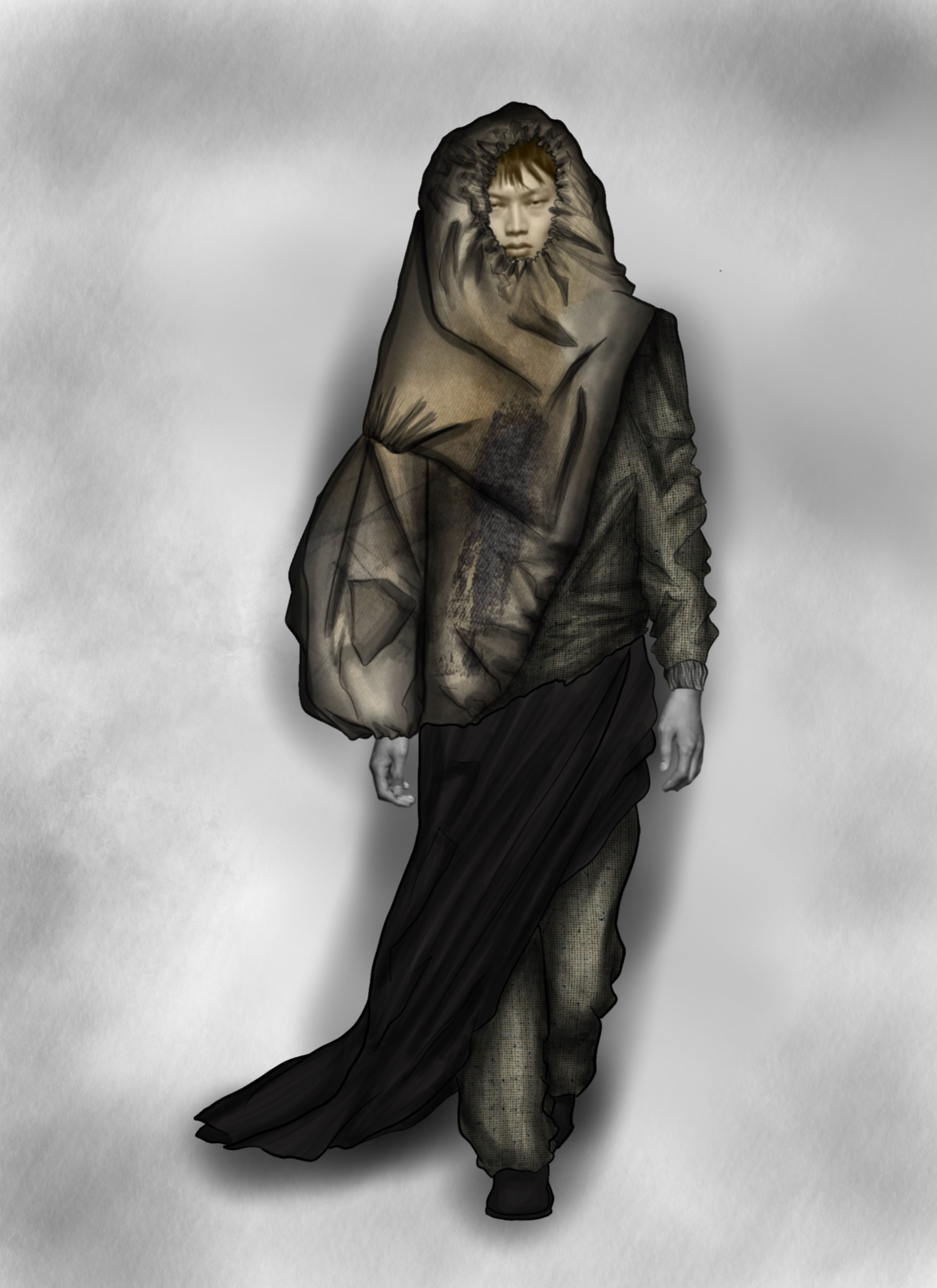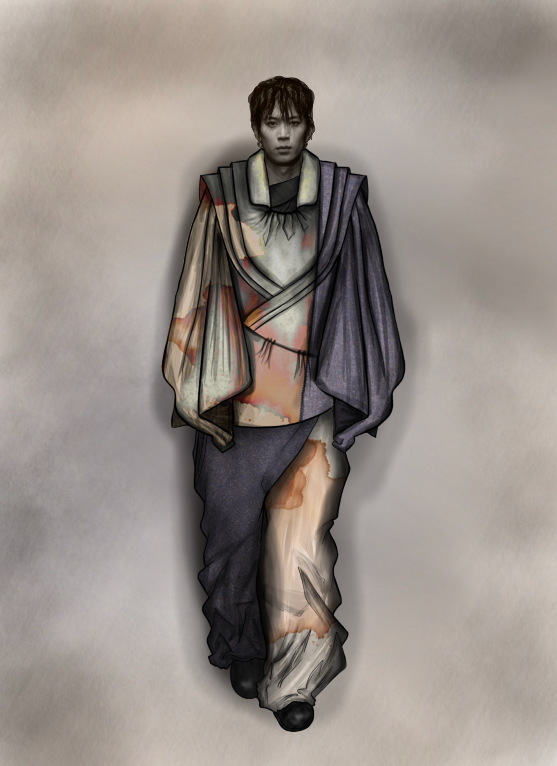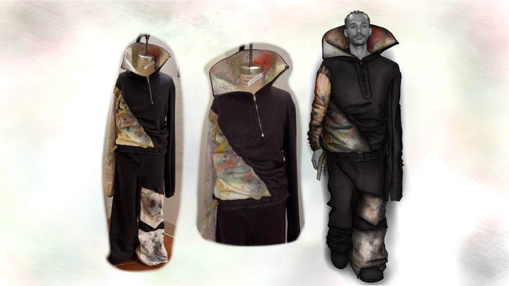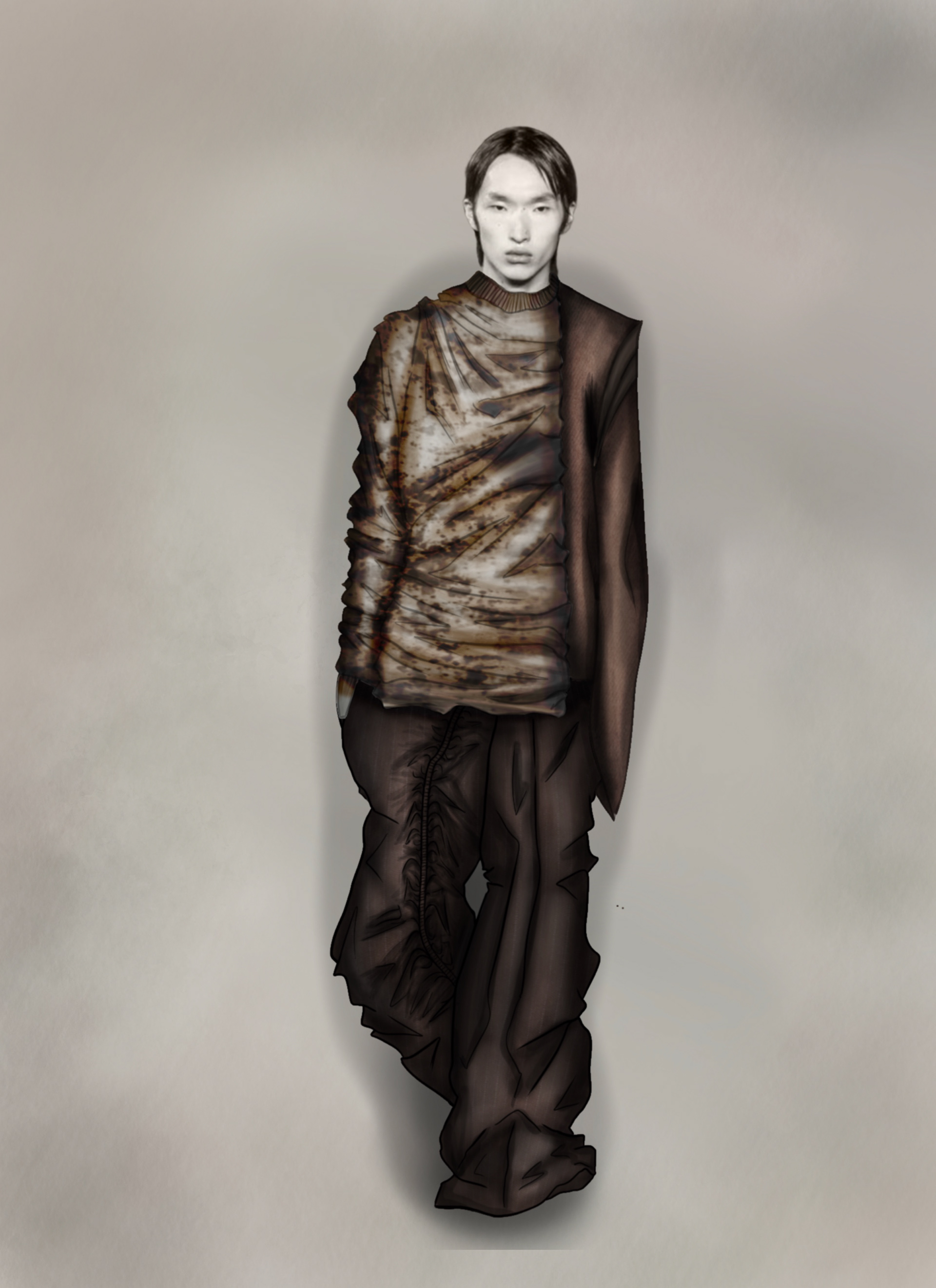 "The Language of the Eco-Artist" is a capsule collection centered around the study and integration of principles used by the American artist Heather Bird Harris. Fully conceived in Florence, Italy, students were provided three meters of wool by Manteco, a company known for circular luxury textiles. I paired this wool with a 10oz canvas I piece dyed with gouache, to emulate the raw pigments used in Heather Bird's works.