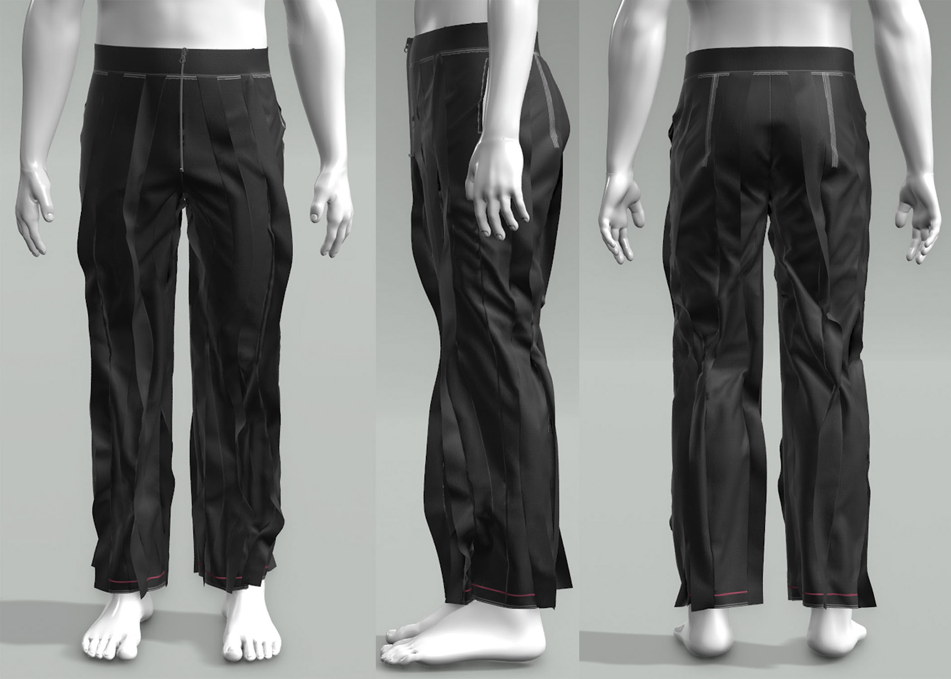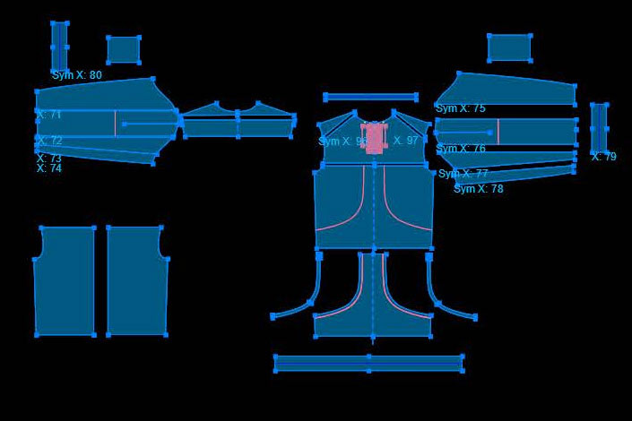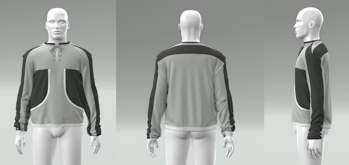 Look Patterned and Rendered using Browzwear Vsticher! Featuring a raglan-sleeve crewneck with an exaggerated front kangaroo pocket, and grommet lace closure system. The Trousers have three-dimensional volume, with facing strips and wavy style lines.